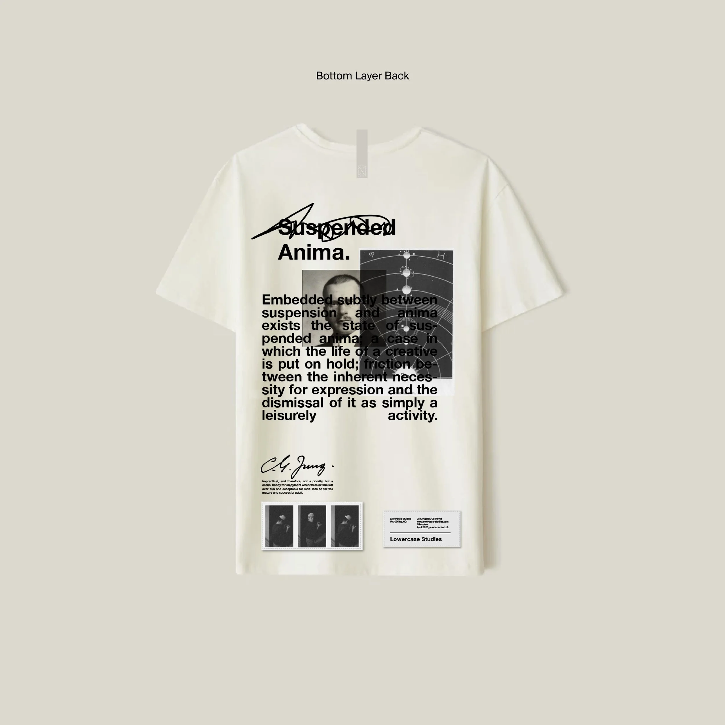 This specific study explores the topic of suspension in relation to Carl Jung’s Animus/Anima theory, ultimately defining the state in which artists are suspended from their creative identities. The case study comes in a sealed package containing a photo zine, a double-layer tee, and two 35mm photo slides.